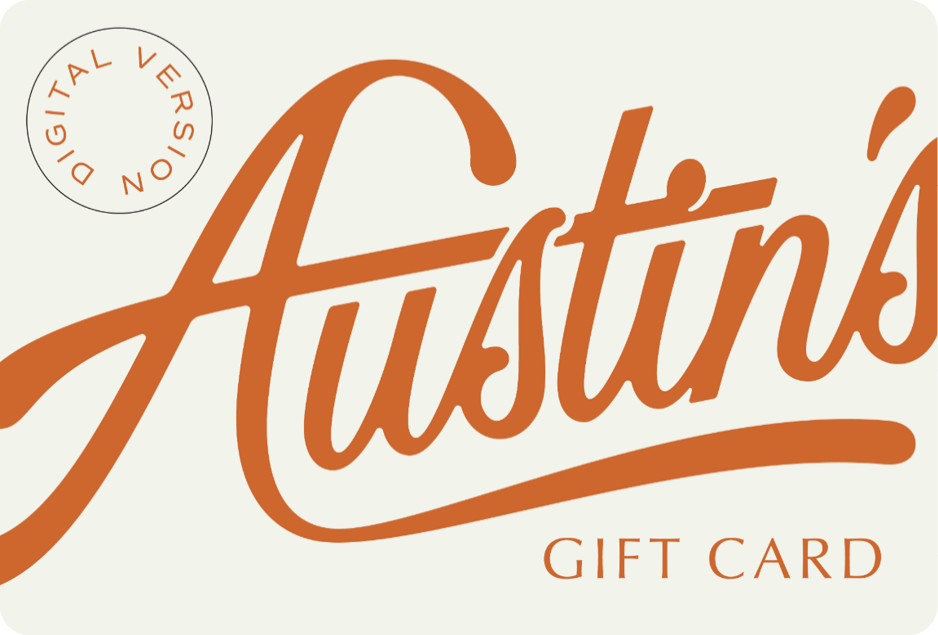 GIVE THE GIFT OF AUSTin’SPurchase a digital gift card today! Gift cards must be redeemed in person. GREAT MEALS MAKE GREAT GIFTS! PURCHASE GIFT CARD hAVE ENOUGh FoR ONE STARTER OR TWO? CHECK CARD BALANCE